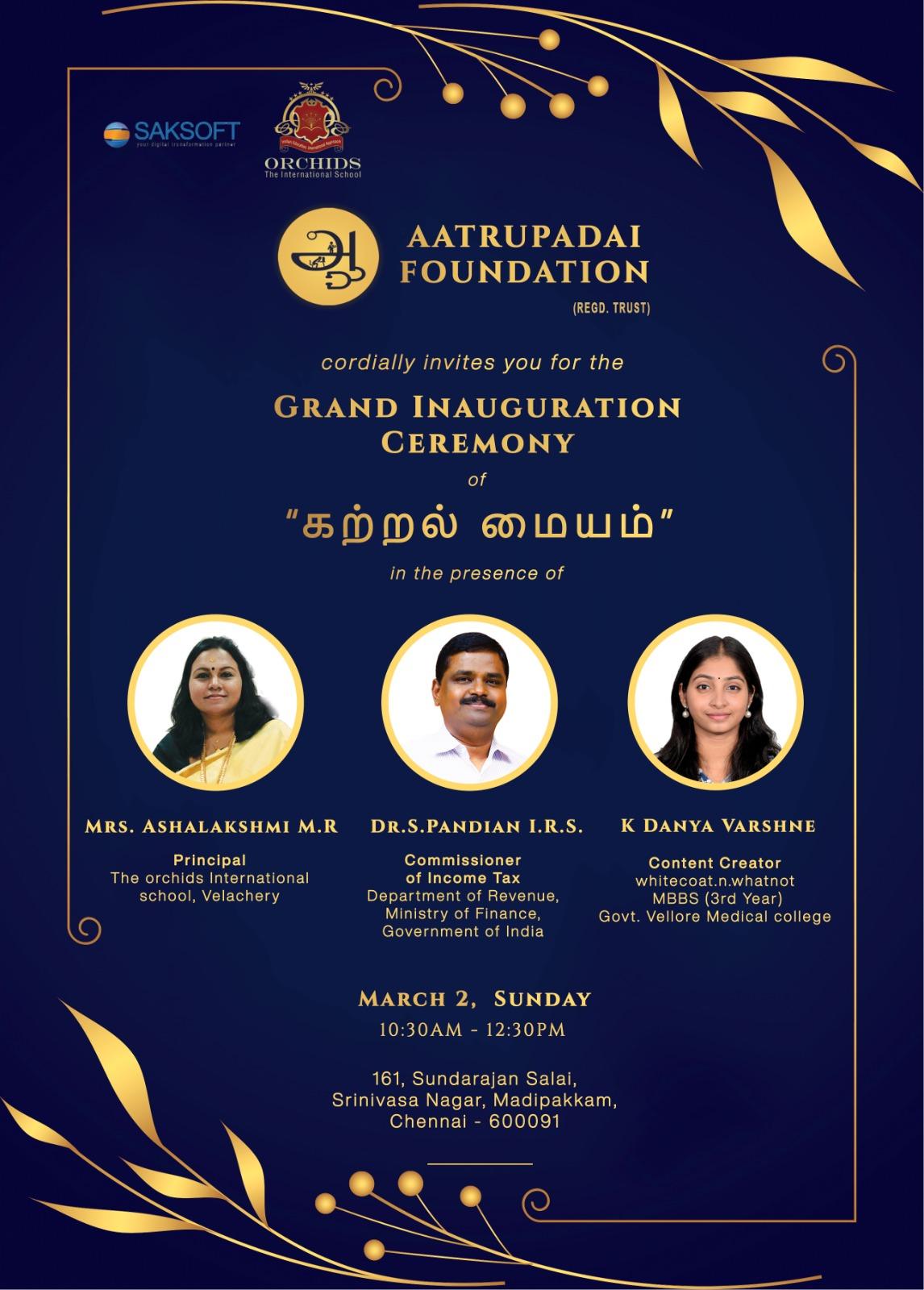 As part of a CSR project initiative, Aatrupadai Foundation, with the generous support of Saksoft Group of Companies and Orchids International School, launched a two-month free offline crash course exclusively for our registered AF students. We are proud to share that over 30 students have enrolled in this intensive program, which includes regular tests, group discussions, free accommodation, and food facilities—all provided at no cost to ensure a focused and supportive learning environment. The inauguration ceremony, held on 2nd March 2025, was graced by distinguished guests: Dr. Pandian, IRS (Revenue Officer, Kochi), Ms. Danya Varshne K (Instagram Medical Content Creator – @whitecoat.whatnot), and Mrs. Ashalakshmi (Principal, Orchids International School). They were joined by our Board Members and dedicated volunteers, delivering insightful and motivating sessions that encouraged students to approach competitive exams with confidence, clarity, and the right mindset. We sincerely thank Saksoft Group, Orchids International School, and all our supporters for turning this impactful initiative into a reality. Aatrupadai Foundation remains steadfast in its mission to empower rural students on their journey toward medical education.